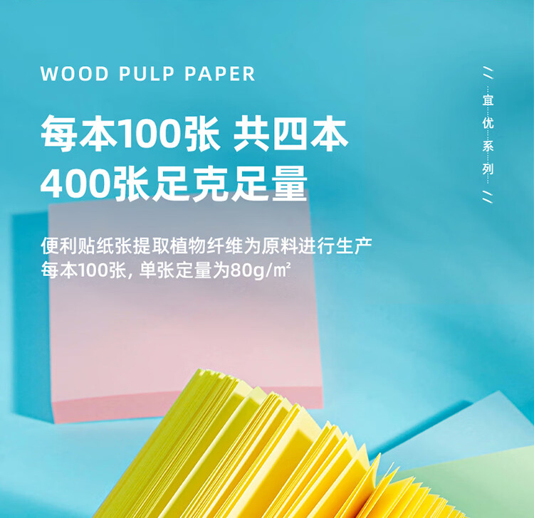 商品名称:得力(deli)400张4色浅调系列淡彩简约便利贴 粘性强书写顺滑76*76mm便签本/记事贴 办公用品