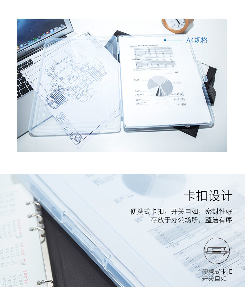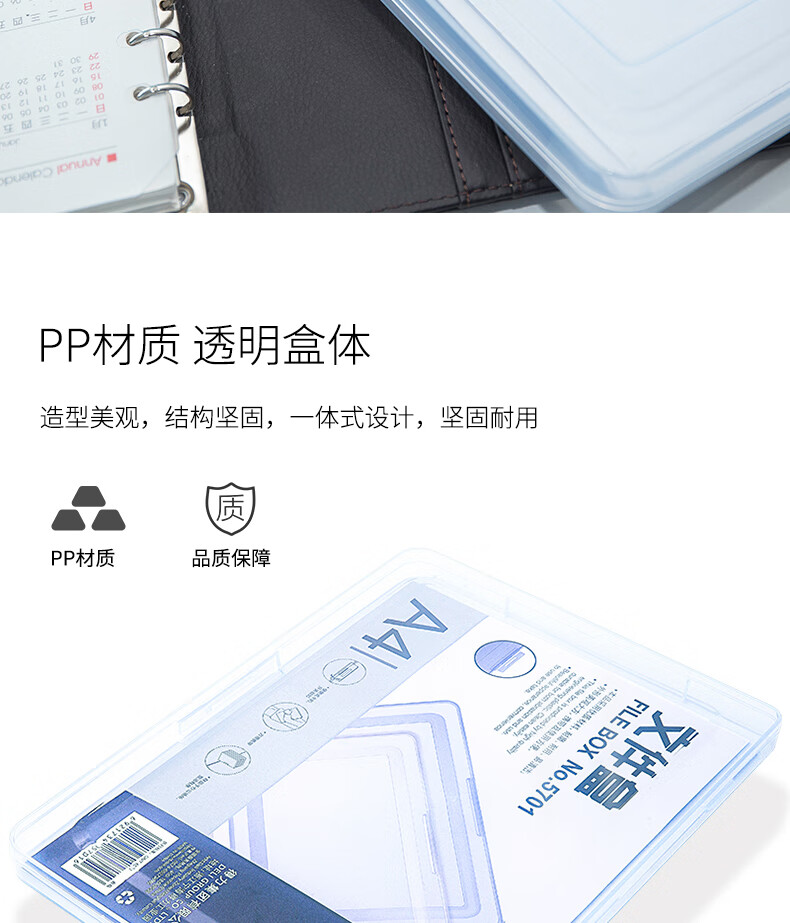 商品名称:得力(deli)A4透明便携卡扣文件盒 文件袋党建档案盒荣誉证书整理资料收纳盒 20mm厚度 5701
